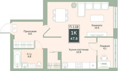 Просторная 1-комнатная квартира 214 в жилом комплексе комфорт-класса Районы-кварталы. Квартира находится в 2 секции 1 этапа. Этаж 12 -й из 17.Квартира с предчистовой отделкой, с продуманной функциональной планировкой: кухня-гостиная 22.7 м2, жилая площадь 19.7 м2, высота потолка 2,76 м.