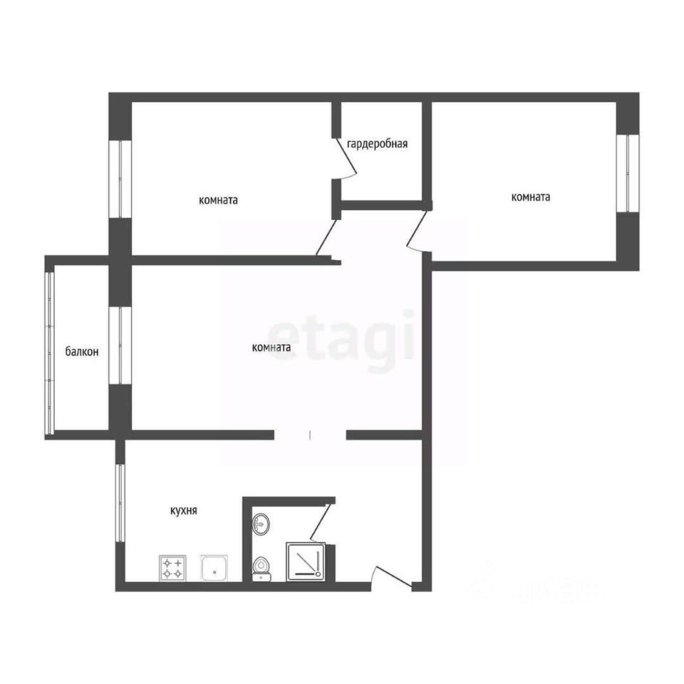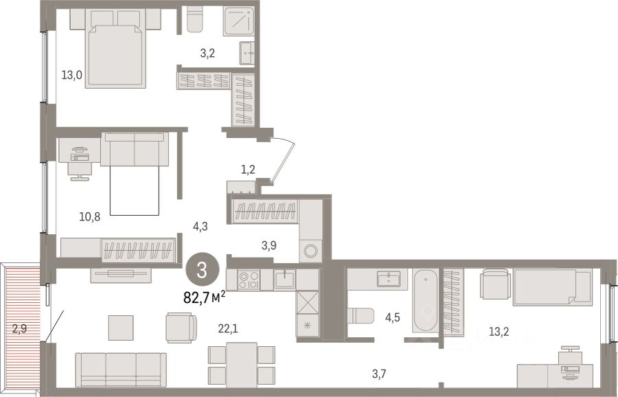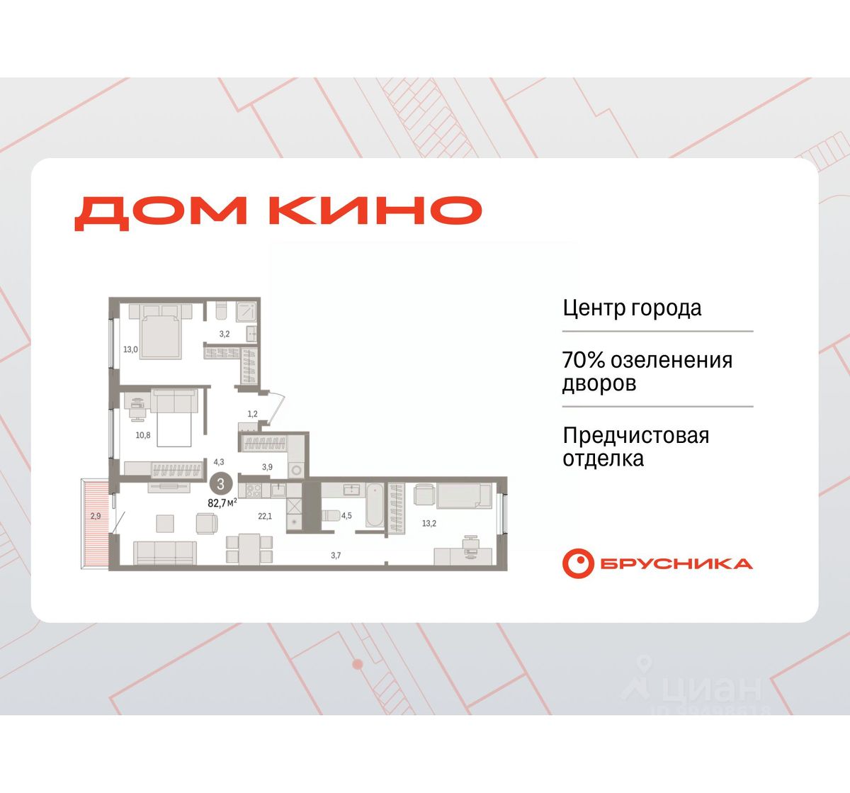 Квартира в счёт первоначального взноса по программе обмена. Звоните, мы вам все подробно расскажем! Трехкомнатная квартира с предчистовой отделкой в ЖК ''Дом Кино'' на 6 этаже. Общая площадь: 82.74 кв.м., жилая: 37 кв.м., площадь просторной кухни-гостиной: 22.1 кв.м. Квартира - распашонка, без проходных комнат, окна выходят на paзные стороны дома. В квартире один балкон, два совмещенных санузла. Высота потолков 2.7 м. Дом монолитный, многоподъездный, переменной этажности, от 8 до 15 этажей. Квартира находится в 1-й секции высотой 8 этажей в корпусе 1. На этаже 5 квартир. В подъезде 1 пассажирский и 1 грузовой лифт. Окончание строительства - 1 квартал 2027 года. Оформление сделки по договору долевого участия. Квартира с кухней-гостиной и тремя спальнями в Доме кино. Особенности планировки: окна на две стороны, вид во двор, разнесённые спальни, предчистовая отделка, мастер-спальня, постирочная, балкон. Район Центр города ''Дом кино'' находится в самом центре Кургана, на пересечении улиц Пролетарская и Карла Маркса. Район насыщен всей необходимой инфраструктурой: здесь есть школы, детские сады, поликлиники, больницы, учреждения культуры и досуга, магазины и рестораны, офисы. Рядом расположены автобусные остановки, поэтому можно быстро добраться в любую часть города без автомобиля. В шаговой доступности от дома находится Курганский государственный университет, художественный музей, библиотека имени Маяковского, филармония, городской сквер и торговый центр ''Звёздный''. Проект Новая точка притяжения Проект расположен на месте бывшего кинотеатра ''Звёздный''. В советское время он считался лучшим в области, сотни людей собирались на премьерные кинопоказы. В 2002 году, когда зданию потребовался капитальный ремонт, ''Звёздный'' был закрыт. В 2012 году кинотеатр снесли, а в 2021 году землю приобрела компания Брусника — под строительство нового проекта, который получил название ''Дом кино''. Проект представляет собой квартал, разомкнутый в сторону сквера. Архитектура дома идентична исторической застройке района и гармонично вписывается в его панораму. Основная часть здания имеет высотность девять этажей. Башня является доминантой и ориентирована на городской сквер, ее высота 15 этажей. Фасады выполнены в теплой цветовой гамме коричневых и песочных оттенков. Яркой архитектурной деталью проекта станет арка высотой более чем в два этажа. Она раскинется над лестницей, которая ведет напрямую в городской сквер из двора. Двор Двор с выходом в сквер Двор - это приватное пространство для жителей, закрытое от машин. В нём спроектированы детская и спортивная площадки, выполненные из натуральных материалов, а также зоны отдыха. Прямой выход в городской сквер расширяет функционал двора. Жители смогут быстро попадать в общественную зону с фонтаном, детскими и спортивными площадками и местами для отдыха. Большую часть территории двора занимает зелень. Озеленение выполнено в стиле пэчворк, и вдохновлено техникой лоскутного шитья. Отдельные фрагмент