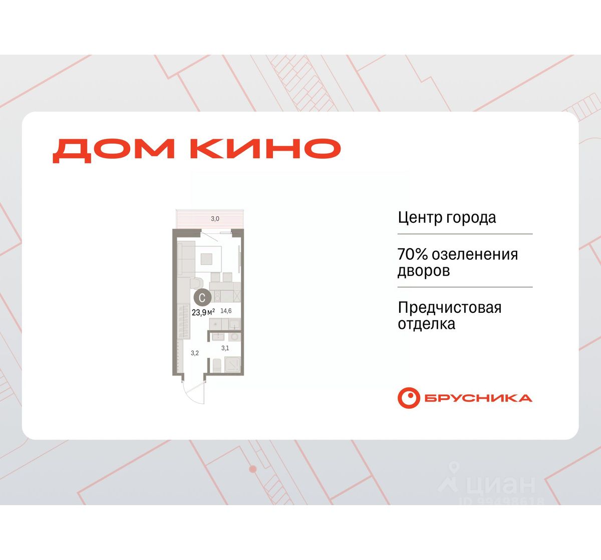 Торопитесь оформить бронирование по акционной цене! Предложение ограничено! Стоимость квартиры указана со скидкой, ваша экономия составит 350,000 RUB. Квартира в счёт первоначального взноса по программе обмена. По всем вопросам обращайтесь в офис продаж, мы вам все подробно расскажем! Однокомнатная студия от застройщика с предчистовой отделкой в ЖК ''Дом Кино'' на 4 этаже. Общая площадь: 23.91 кв.м., площадь гостиной 14.6 кв.м., из которых 5 кв.м. выделено под кухонную зону. Все окна выходят на одну сторону. В квартире один балкон, один совмещенный санузел. Высота потолков 2.7 м. Дом монолитный, многоподъездный, переменной этажности, от 8 до 15 этажей. Квартира находится в 6-й секции высотой 15 этажей в корпусе 1. На этаже 7 квартир. В подъезде 2 пассажирских и 1 грузовой лифт. Окончание строительства - 1 квартал 2027 года. Оформление сделки по договору долевого участия. Студия в Доме кино. Особенности планировки: предчистовая отделка, балкон. Район Центр города ''Дом кино'' находится в самом центре Кургана, на пересечении улиц Пролетарская и Карла Маркса. Район насыщен всей необходимой инфраструктурой: здесь есть школы, детские сады, поликлиники, больницы, учреждения культуры и досуга, магазины и рестораны, офисы. Рядом расположены автобусные остановки, поэтому можно быстро добраться в любую часть города без автомобиля. В шаговой доступности от дома находится Курганский государственный университет, художественный музей, библиотека имени Маяковского, филармония, городской сквер и торговый центр ''Звёздный''. Проект Новая точка притяжения Проект расположен на месте бывшего кинотеатра ''Звёздный''. В советское время он считался лучшим в области, сотни людей собирались на премьерные кинопоказы. В 2002 году, когда зданию потребовался капитальный ремонт, ''Звёздный'' был закрыт. В 2012 году кинотеатр снесли, а в 2021 году землю приобрела компания Брусника — под строительство нового проекта, который получил название ''Дом кино''. Проект представляет собой квартал, разомкнутый в сторону сквера. Архитектура дома идентична исторической застройке района и гармонично вписывается в его панораму. Основная часть здания имеет высотность девять этажей. Башня является доминантой и ориентирована на городской сквер, ее высота 15 этажей. Фасады выполнены в теплой цветовой гамме коричневых и песочных оттенков. Яркой архитектурной деталью проекта станет арка высотой более чем в два этажа. Она раскинется над лестницей, которая ведет напрямую в городской сквер из двора. Двор Двор с выходом в сквер Двор - это приватное пространство для жителей, закрытое от машин. В нём спроектированы детская и спортивная площадки, выполненные из натуральных материалов, а также зоны отдыха. Прямой выход в городской сквер расширяет функционал двора. Жители смогут быстро попадать в общественную зону с фонтаном, детскими и спортивными площадками и местами для отдыха. Большую часть территории двора занимает зелень. Озеленение выполнено в стиле пэчворк, и вдохновлено т