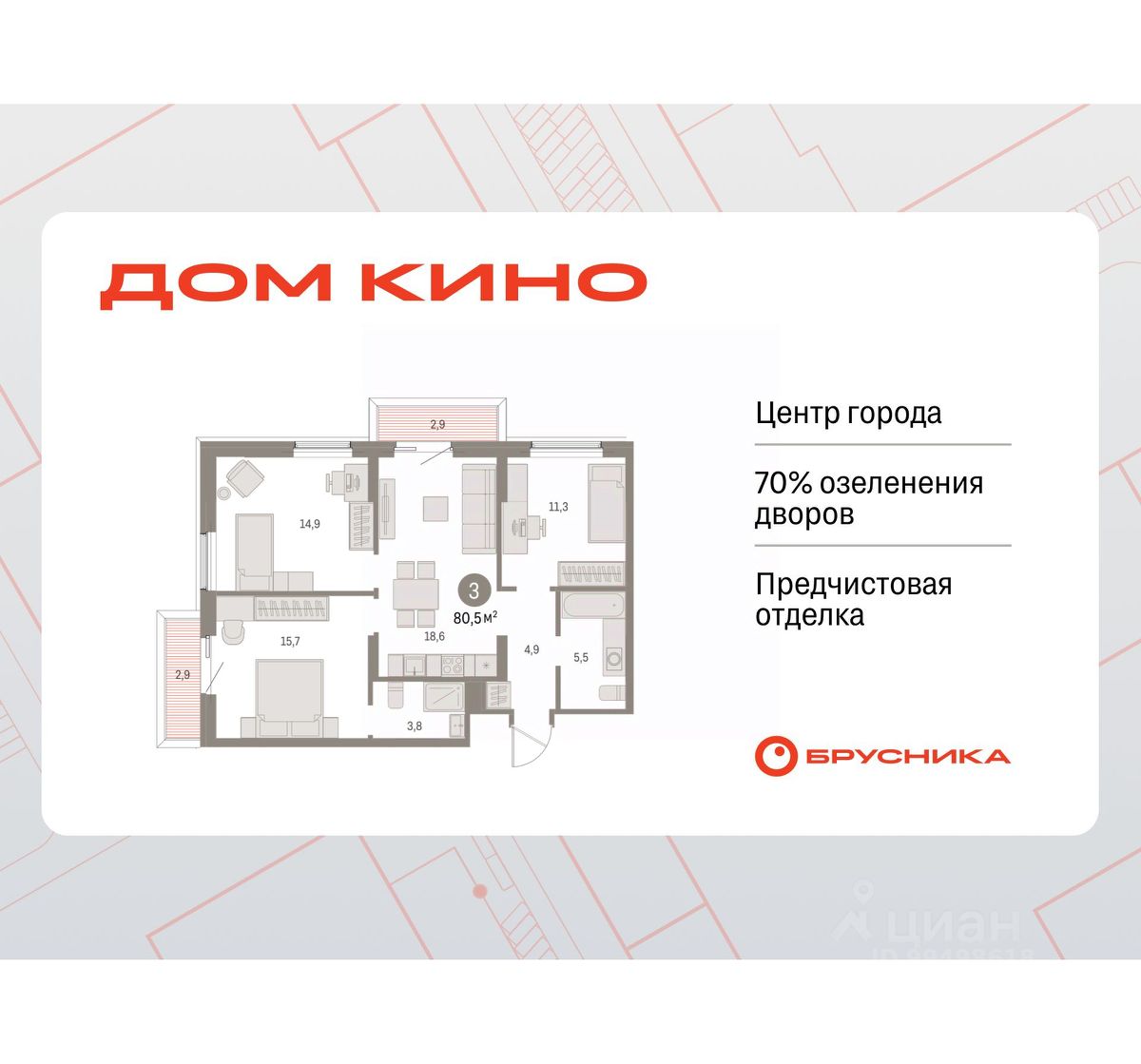 Квартира в счёт первоначального взноса по программе обмена. Звоните, наши менеджеры вам все расскажут! Просторная трехкомнатная квартира с предчистовой отделкой в ЖК ''Дом Кино'' на 2 этаже. Общая площадь: 80.34 кв.м., жилая: 41.9 кв.м., площадь просторной кухни-гостиной: 18.6 кв.м. Угловая квартира, идеально подойдет любителям тишины и панорамных видов. В квартире два балкона, два совмещенных санузла. Высота потолков 2.7 м. Дом монолитный, многоподъездный, переменной этажности, от 8 до 15 этажей. Квартира находится в 5-й секции высотой 9 этажей в корпусе 1. На этаже 8 квартир. В подъезде 1 пассажирский и 1 грузовой лифт. Окончание строительства - 1 квартал 2027 года. Оформление сделки по договору долевого участия. Продаётся с паркингом. Квартира с кухней-гостиной и тремя спальнями в Доме кино. Особенности планировки: разнесённые спальни, предчистовая отделка, мастер-спальня, балкон. Район Центр города ''Дом кино'' находится в самом центре Кургана, на пересечении улиц Пролетарская и Карла Маркса. Район насыщен всей необходимой инфраструктурой: здесь есть школы, детские сады, поликлиники, больницы, учреждения культуры и досуга, магазины и рестораны, офисы. Рядом расположены автобусные остановки, поэтому можно быстро добраться в любую часть города без автомобиля. В шаговой доступности от дома находится Курганский государственный университет, художественный музей, библиотека имени Маяковского, филармония, городской сквер и торговый центр ''Звёздный''. Проект Новая точка притяжения Проект расположен на месте бывшего кинотеатра ''Звёздный''. В советское время он считался лучшим в области, сотни людей собирались на премьерные кинопоказы. В 2002 году, когда зданию потребовался капитальный ремонт, ''Звёздный'' был закрыт. В 2012 году кинотеатр снесли, а в 2021 году землю приобрела компания Брусника — под строительство нового проекта, который получил название ''Дом кино''. Проект представляет собой квартал, разомкнутый в сторону сквера. Архитектура дома идентична исторической застройке района и гармонично вписывается в его панораму. Основная часть здания имеет высотность девять этажей. Башня является доминантой и ориентирована на городской сквер, ее высота 15 этажей. Фасады выполнены в теплой цветовой гамме коричневых и песочных оттенков. Яркой архитектурной деталью проекта станет арка высотой более чем в два этажа. Она раскинется над лестницей, которая ведет напрямую в городской сквер из двора. Двор Двор с выходом в сквер Двор - это приватное пространство для жителей, закрытое от машин. В нём спроектированы детская и спортивная площадки, выполненные из натуральных материалов, а также зоны отдыха. Прямой выход в городской сквер расширяет функционал двора. Жители смогут быстро попадать в общественную зону с фонтаном, детскими и спортивными площадками и местами для отдыха. Большую часть территории двора занимает зелень. Озеленение выполнено в стиле пэчворк, и вдохновлено техникой лоскутного шитья. Отдельные фрагменты ландшафта, под