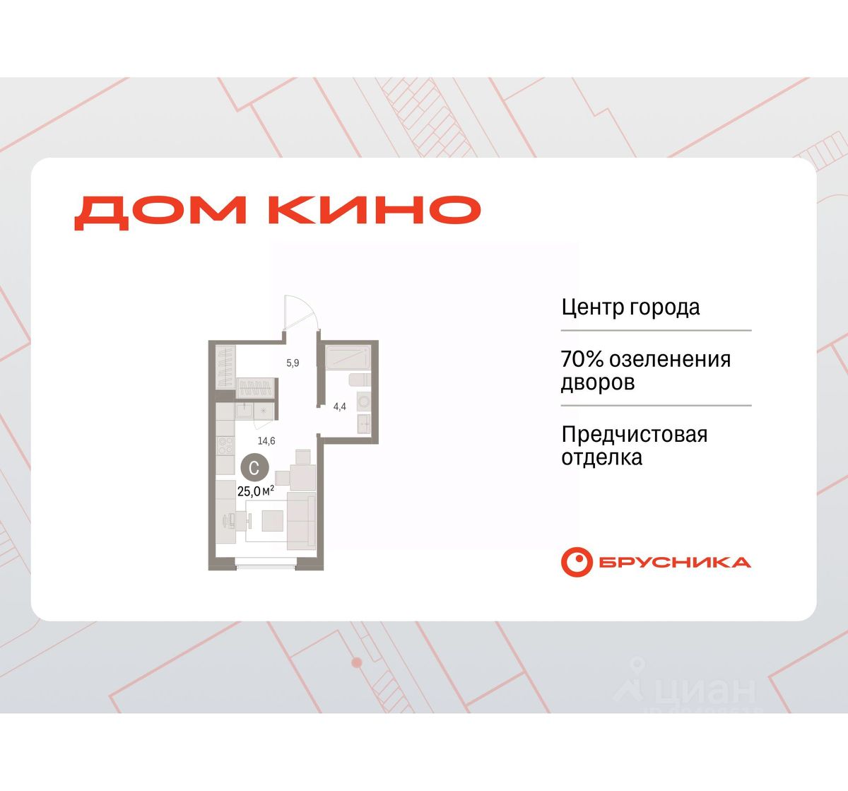 Квартира в счёт первоначального взноса по программе обмена. По всем вопросам звоните в офис продаж, мы вам все подробно расскажем! Просторная 1-комн. студия с предчистовой отделкой в ЖК ''Дом Кино'' на 2 этаже. Общая площадь: 25.01 кв.м., площадь гостиной 14.6 кв.м., из которых 5 кв.м. выделено под кухонную зону. Все окна выходят на одну сторону. В квартире один совмещенный санузел. Высота потолков 2.7 м. Дом монолитный, многоподъездный, переменной этажности, от 8 до 15 этажей. Квартира находится в 3-й секции высотой 9 этажей в корпусе 1. На этаже 7 квартир. В подъезде 1 пассажирский и 1 грузовой лифт. Окончание строительства - 1 квартал 2027 года. Оформление сделки по договору долевого участия. Студия в Доме кино. Особенности планировки: предчистовая отделка. Район Центр города ''Дом кино'' находится в самом центре Кургана, на пересечении улиц Пролетарская и Карла Маркса. Район насыщен всей необходимой инфраструктурой: здесь есть школы, детские сады, поликлиники, больницы, учреждения культуры и досуга, магазины и рестораны, офисы. Рядом расположены автобусные остановки, поэтому можно быстро добраться в любую часть города без автомобиля. В шаговой доступности от дома находится Курганский государственный университет, художественный музей, библиотека имени Маяковского, филармония, городской сквер и торговый центр ''Звёздный''. Проект Новая точка притяжения Проект расположен на месте бывшего кинотеатра ''Звёздный''. В советское время он считался лучшим в области, сотни людей собирались на премьерные кинопоказы. В 2002 году, когда зданию потребовался капитальный ремонт, ''Звёздный'' был закрыт. В 2012 году кинотеатр снесли, а в 2021 году землю приобрела компания Брусника — под строительство нового проекта, который получил название ''Дом кино''. Проект представляет собой квартал, разомкнутый в сторону сквера. Архитектура дома идентична исторической застройке района и гармонично вписывается в его панораму. Основная часть здания имеет высотность девять этажей. Башня является доминантой и ориентирована на городской сквер, ее высота 15 этажей. Фасады выполнены в теплой цветовой гамме коричневых и песочных оттенков. Яркой архитектурной деталью проекта станет арка высотой более чем в два этажа. Она раскинется над лестницей, которая ведет напрямую в городской сквер из двора. Двор Двор с выходом в сквер Двор - это приватное пространство для жителей, закрытое от машин. В нём спроектированы детская и спортивная площадки, выполненные из натуральных материалов, а также зоны отдыха. Прямой выход в городской сквер расширяет функционал двора. Жители смогут быстро попадать в общественную зону с фонтаном, детскими и спортивными площадками и местами для отдыха. Большую часть территории двора занимает зелень. Озеленение выполнено в стиле пэчворк, и вдохновлено техникой лоскутного шитья. Отдельные фрагменты ландшафта, подобно лоскутам, гармонично складываются в планировочные элементы, а затем формируют цельную композицию. Растения представлены ра