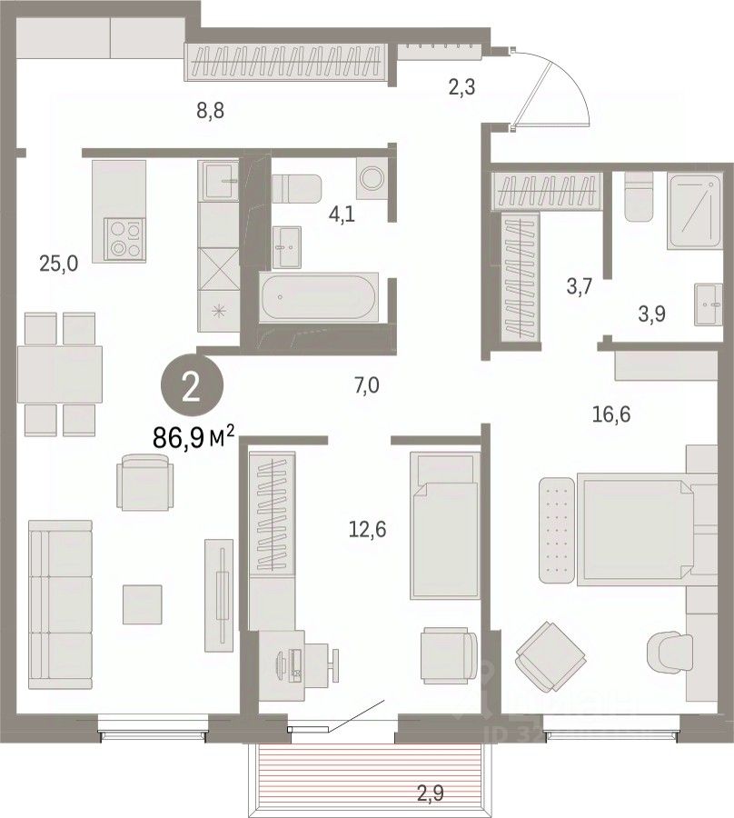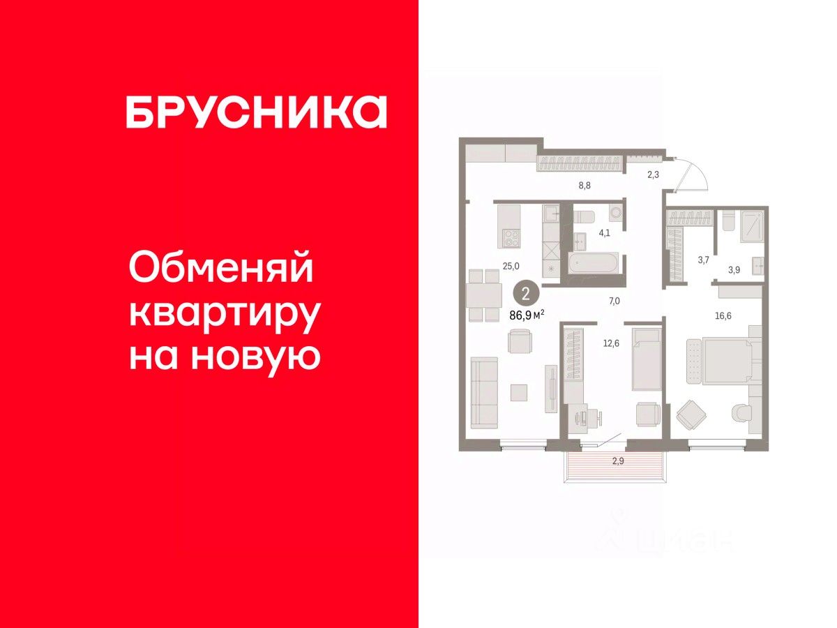 Просторная 2-комн. квартира с предчистовой отделкой в ЖК ''Дом Кино'' на 9 этаже. Общая площадь: 86.89 кв.м., жилая: 29.2 кв.м., площадь просторной кухни-гостиной: 25 кв.м. Комнаты изолированные, все окна выходят на одну сторону. В квартире один балкон, два совмещенных санузла. Высота потолков 2.7 м. Дом монолитный, многоподъездный, переменной этажности, от 8 до 15 этажей. Квартира находится в 6-й секции высотой 15 этажей в корпусе 1. На этаже 7 квартир. В подъезде 2 пассажирских и 1 грузовой лифт. Окончание строительства - 1 квартал 2027 года. Оформление сделки по договору долевого участия. Квартира с кухней-гостиной и двумя спальнями в Доме кино. Особенности планировки: балкон, вид во двор, гардеробная, мастер-спальня, предчистовая отделка, разнесённые спальни. Район Центр города ''Дом кино'' находится в самом центре Кургана, на пересечении улиц Пролетарская и Карла Маркса. Район насыщен всей необходимой инфраструктурой: здесь есть школы, детские сады, поликлиники, больницы, учреждения культуры и досуга, магазины и рестораны, офисы. Рядом расположены автобусные остановки, поэтому можно быстро добраться в любую часть города без автомобиля. В шаговой доступности от дома находится Курганский государственный университет, художественный музей, библиотека имени Маяковского, филармония, городской сквер и торговый центр ''Звёздный''. Проект Новая точка притяжения Проект расположен на месте бывшего кинотеатра ''Звёздный''. В советское время он считался лучшим в области, сотни людей собирались на премьерные кинопоказы. В 2002 году, когда зданию потребовался капитальный ремонт, ''Звёздный'' был закрыт. В 2012 году кинотеатр снесли, а в 2021 году землю приобрела компания Брусника — под строительство нового проекта, который получил название ''Дом кино''. Проект представляет собой квартал, разомкнутый в сторону сквера. Архитектура дома идентична исторической застройке района и гармонично вписывается в его панораму. Основная часть здания имеет высотность девять этажей. Башня является доминантой и ориентирована на городской сквер, ее высота 15 этажей. Фасады выполнены в теплой цветовой гамме коричневых и песочных оттенков. Яркой архитектурной деталью проекта станет арка высотой более чем в два этажа. Она раскинется над лестницей, которая ведет напрямую в городской сквер из двора. Двор Двор с выходом в сквер Двор - это приватное пространство для жителей, закрытое от машин. В нём спроектированы детская и спортивная площадки, выполненные из натуральных материалов, а также зоны отдыха. Прямой выход в городской сквер расширяет функционал двора. Жители смогут быстро попадать в общественную зону с фонтаном, детскими и спортивными площадками и местами для отдыха. Большую часть территории двора занимает зелень. Озеленение выполнено в стиле пэчворк, и вдохновлено техникой лоскутного шитья. Отдельные фрагменты ландшафта, подобно лоскутам, гармонично складываются в планировочные элементы, а затем формируют цельную композицию. Растения представлены ра