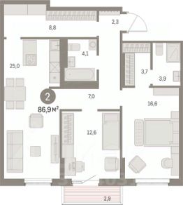 Просторная 2-комн. квартира с предчистовой отделкой в ЖК ''Дом Кино'' на 9 этаже. Общая площадь: 86.89 кв.м., жилая: 29.2 кв.м., площадь просторной кухни-гостиной: 25 кв.м. Комнаты изолированные, все окна выходят на одну сторону. В квартире один балкон, два совмещенных санузла. Высота потолков 2.7 м. Дом монолитный, многоподъездный, переменной этажности, от 8 до 15 этажей. Квартира находится в 6-й секции высотой 15 этажей в корпусе 1. На этаже 7 квартир. В подъезде 2 пассажирских и 1 грузовой лифт. Окончание строительства - 1 квартал 2027 года. Оформление сделки по договору долевого участия. Квартира с кухней-гостиной и двумя спальнями в Доме кино. Особенности планировки: балкон, вид во двор, гардеробная, мастер-спальня, предчистовая отделка, разнесённые спальни.Район Центр города ''Дом кино'' находится в самом центре Кургана, на пересечении улиц Пролетарская и Карла Маркса. Район насыщен всей необходимой инфраструктурой: здесь есть школы, детские сады, поликлиники, больницы, учреждения культуры и досуга, магазины и рестораны, офисы.Рядом расположены автобусные остановки, поэтому можно быстро добраться в любую часть города без автомобиля. В шаговой доступности от дома находится Курганский государственный университет, художественный музей, библиотека имени Маяковского, филармония, городской сквер и торговый центр ''Звёздный''. Проект Новая точка притяжения Проект расположен на месте бывшего кинотеатра ''Звёздный''. В советское время он считался лучшим в области, сотни людей собирались на премьерные кинопоказы. В 2002 году, когда зданию потребовался капитальный ремонт, ''Звёздный'' был закрыт. В 2012 году кинотеатр снесли, а в 2021 году землю приобрела компания Брусника — под строительство нового проекта, который получил название ''Дом кино''. Проект представляет собой квартал, разомкнутый в сторону сквера. Архитектура дома идентична исторической застройке района и гармонично вписывается в его панораму. Основная часть здания имеет высотность девять этажей. Башня является доминантой и ориентирована на городской сквер, ее высота 15 этажей. Фасады выполнены в теплой цветовой гамме коричневых и песочных оттенков. Яркой архитектурной деталью проекта станет арка высотой более чем в два этажа. Она раскинется над лестницей, которая ведет напрямую в городской сквер из двора. Двор Двор с выходом в сквер Двор - это приватное пространство для жителей, закрытое от машин. В нём спроектированы детская и спортивная площадки, выполненные из натуральных материалов, а также зоны отдыха. Прямой выход в городской сквер расширяет функционал двора. Жители смогут быстро попадать в общественную зону с фонтаном, детскими и спортивными площадками и местами для отдыха.Большую часть территории двора занимает зелень. Озеленение выполнено в стиле пэчворк, и вдохновлено техникой лоскутного шитья. Отдельные фрагменты ландшафта, подобно лоскутам, гармонично складываются в планировочные элементы, а затем формируют цельную композицию.Растения представлены ра