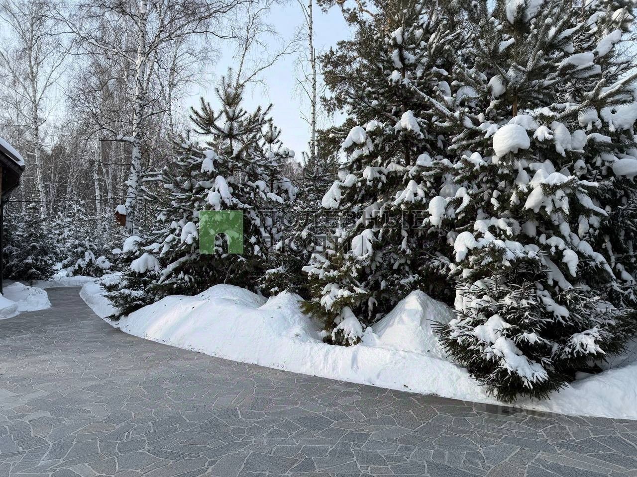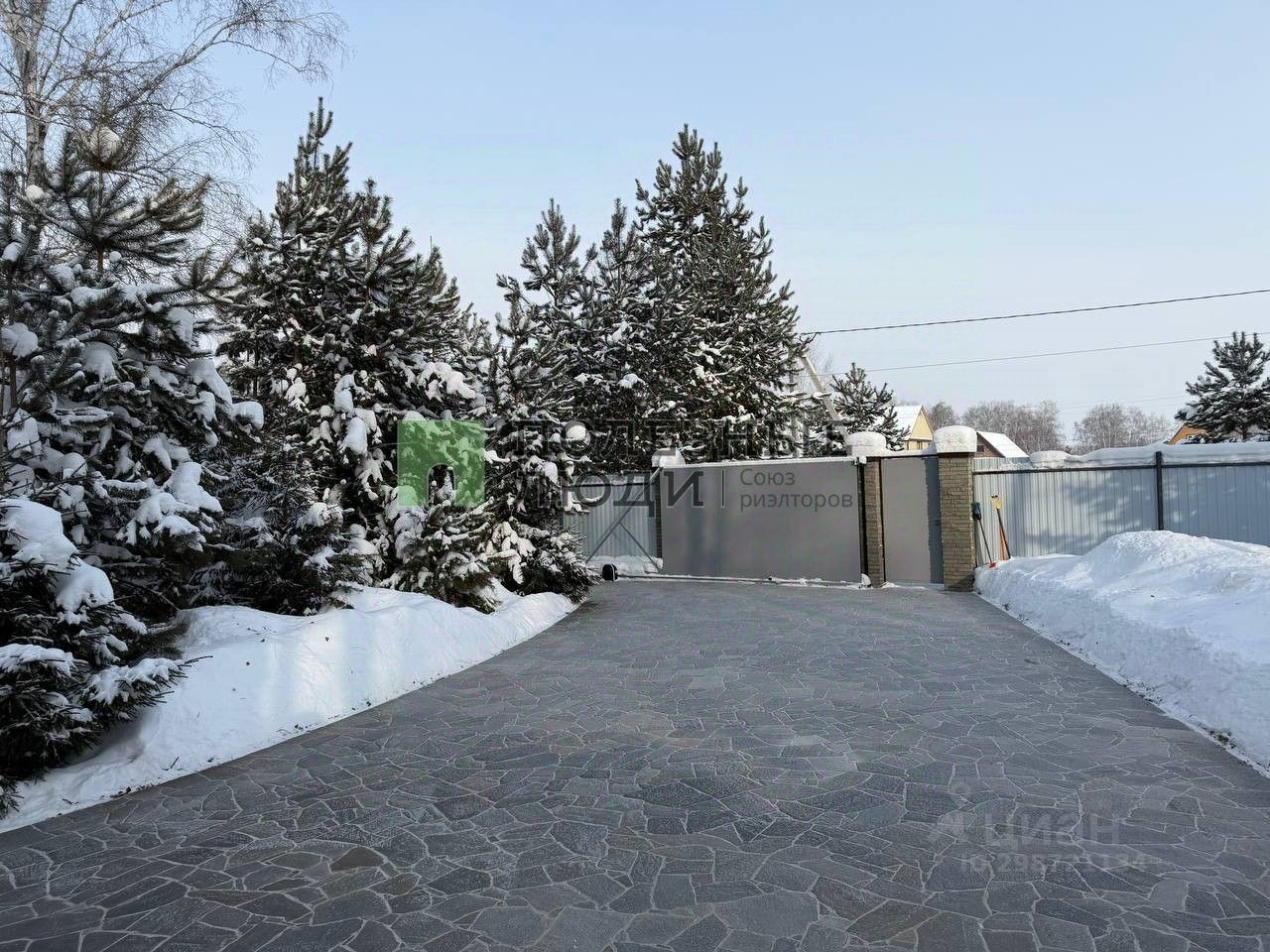 Территория перед домом вымощена камнем, ворота на пульте.