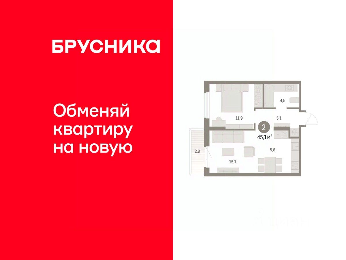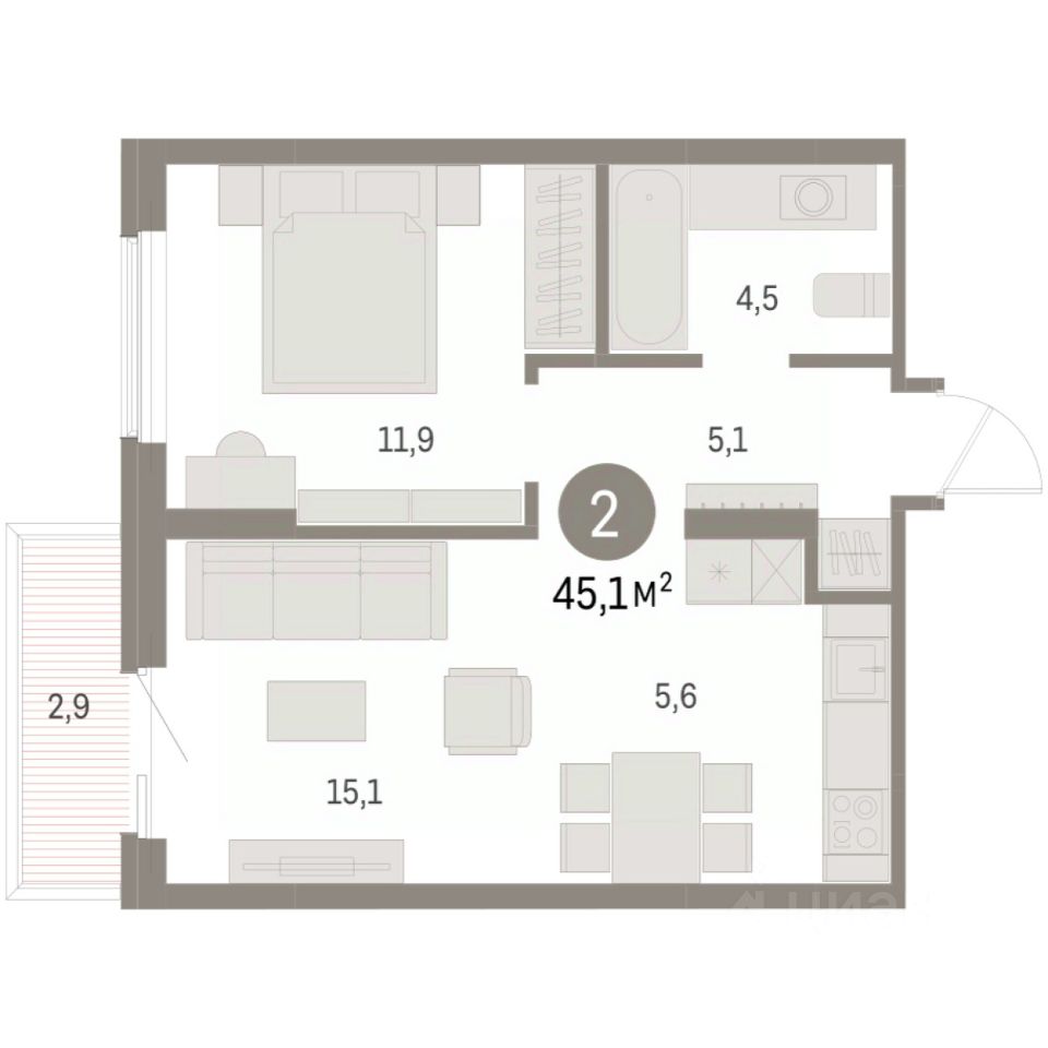 Общая площадь45,11 м2