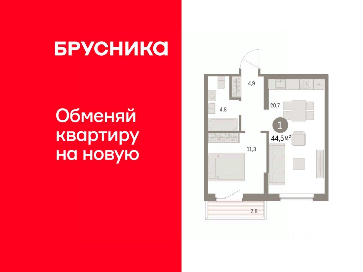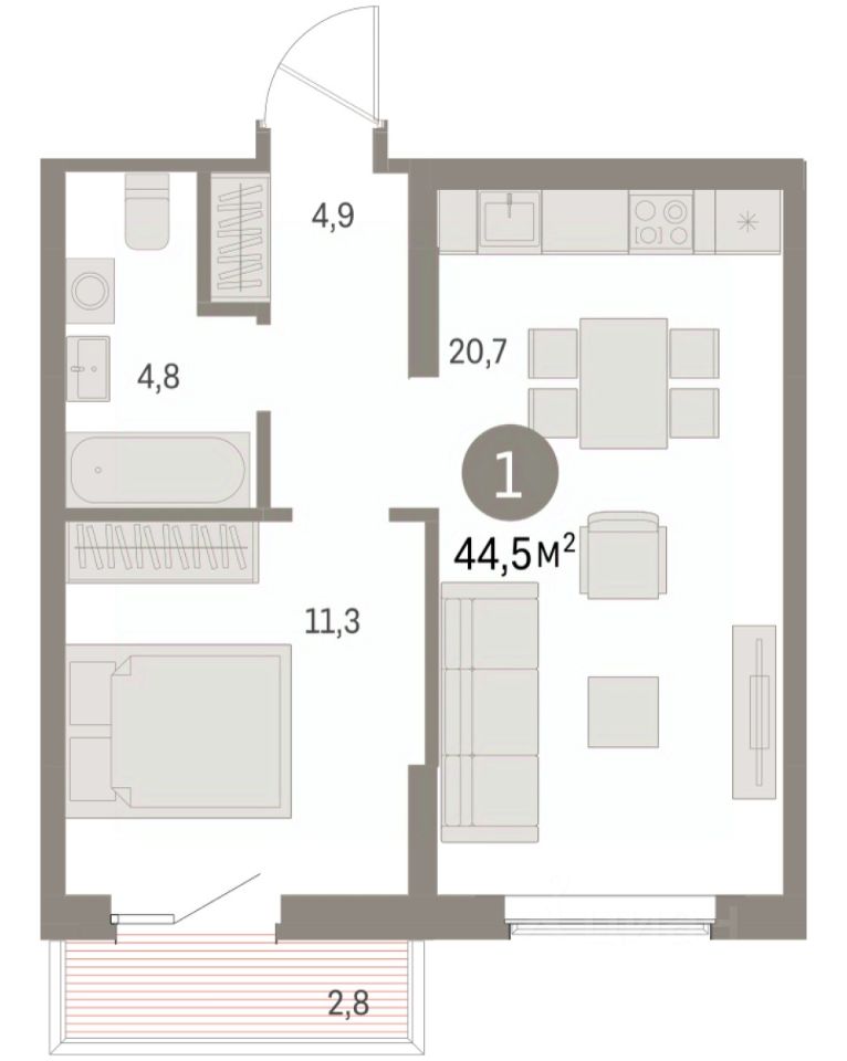 Однокомнатная квартира от застройщика с предчистовой отделкой в ЖК ''Дом Кино'' на 7 этаже. Общая площадь: 44.46 кв.м., жилая: 11.3 кв.м., площадь просторной кухни-гостиной: 20.7 кв.м. Все окна выходят на одну сторону. В квартире один балкон, один совмещенный санузел. Высота потолков 2.7 м.