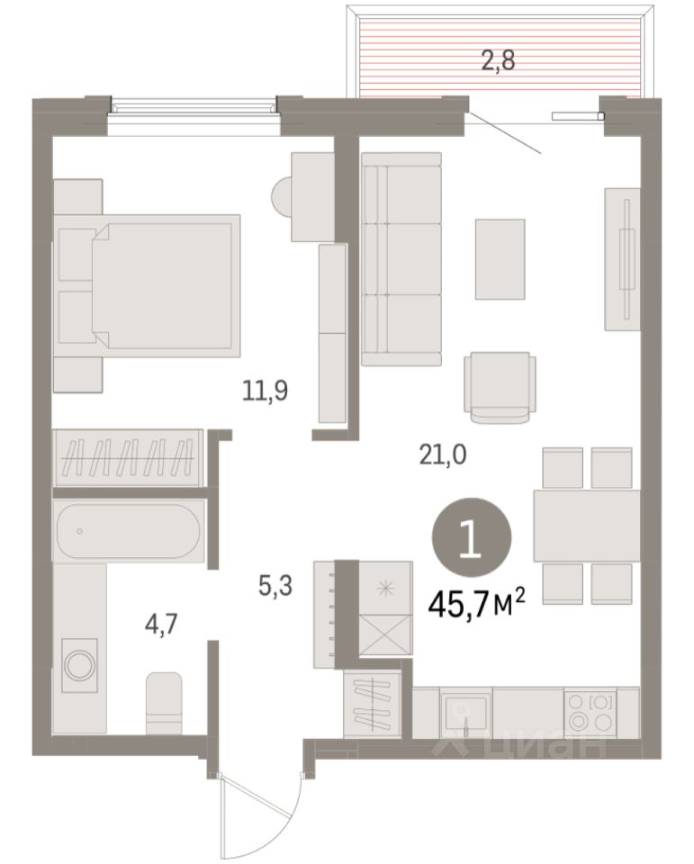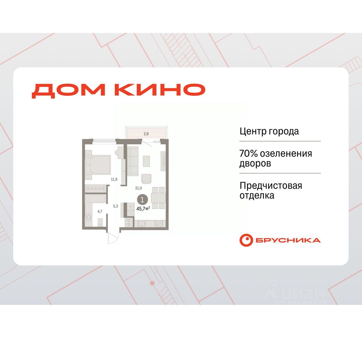Продается 1-комн. квартира от застройщика с предчистовой отделкой в ЖК ''Дом Кино'' на 8 этаже. Общая площадь: 45.68 кв.м., жилая: 11.9 кв.м., площадь просторной кухни-гостиной: 21 кв.м. Все окна выходят на одну сторону. В квартире один балкон, один совмещенный санузел. Высота потолков 2.7 м.