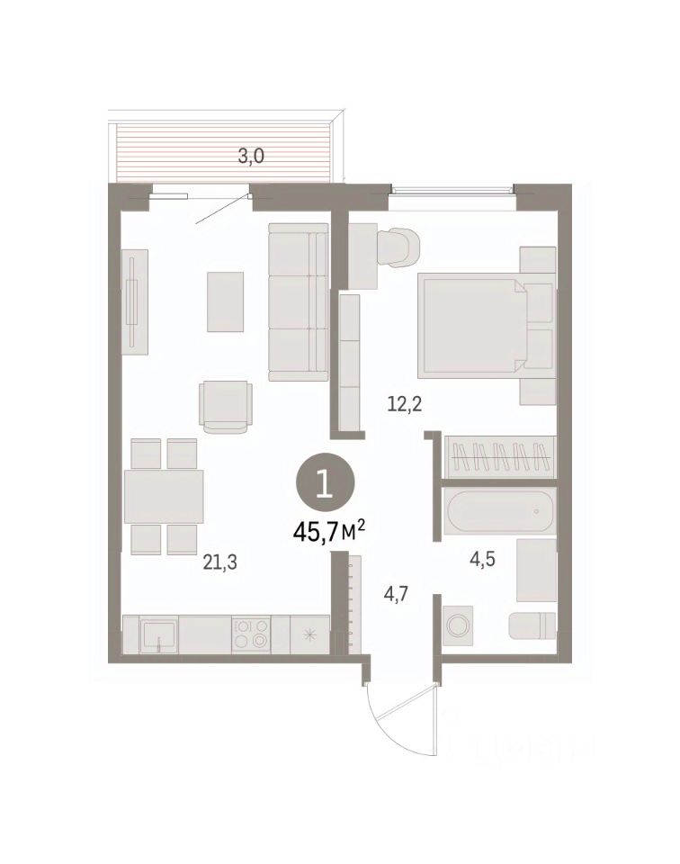 Однокомнатная квартира от застройщика с предчистовой отделкой в ЖК ''Дом Кино'' на 3 этаже. Общая площадь: 45.7 кв.м., жилая: 12.2 кв.м., площадь просторной кухни-гостиной: 21.3 кв.м. Все окна выходят на одну сторону. В квартире один балкон, один совмещенный санузел. Высота потолков 2.7 м.