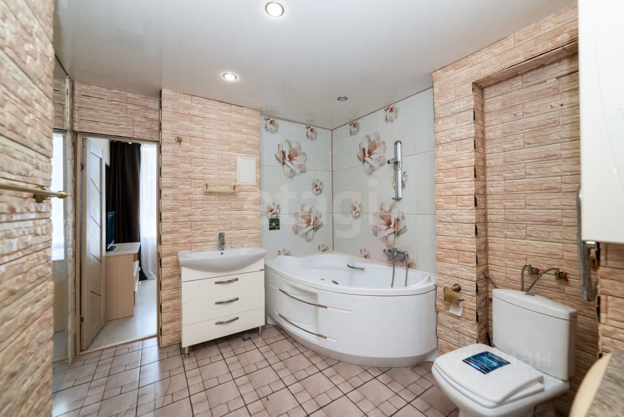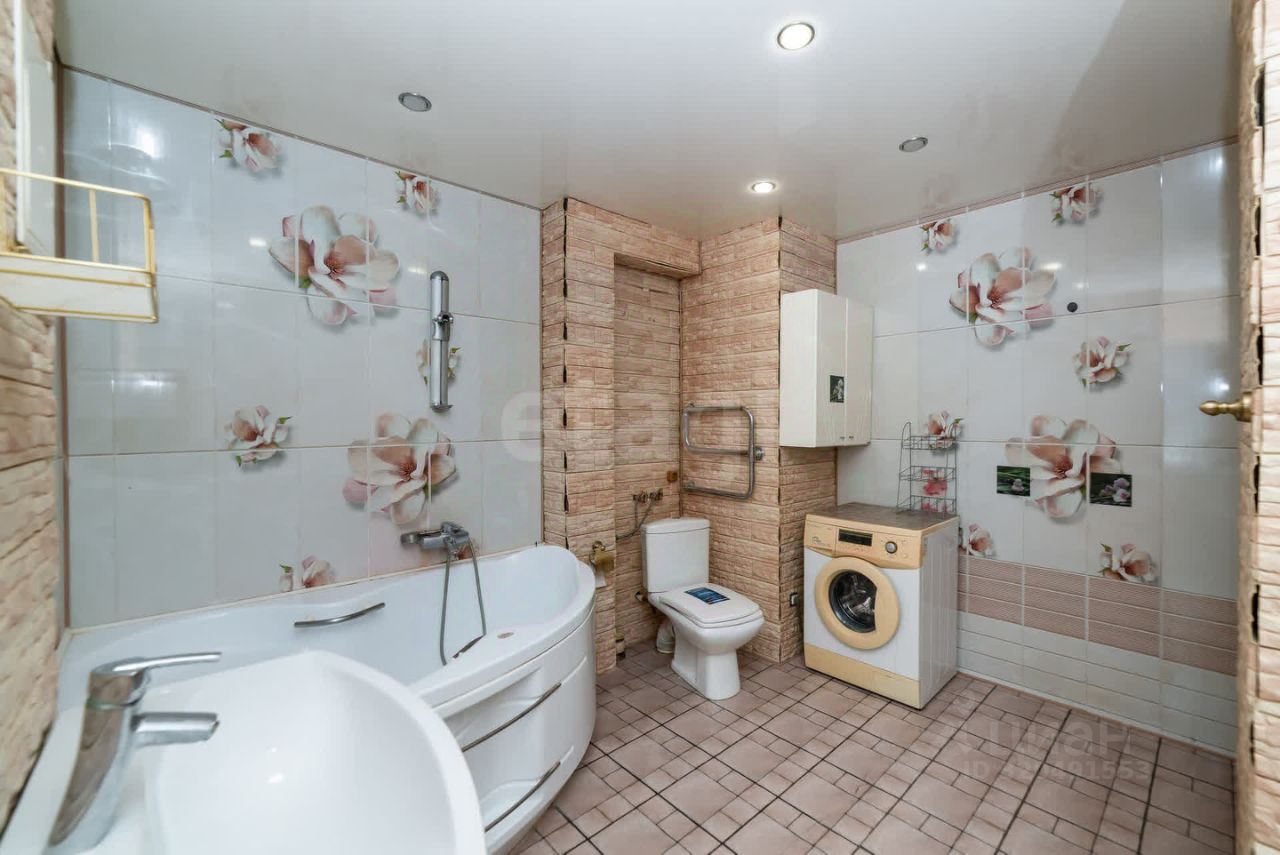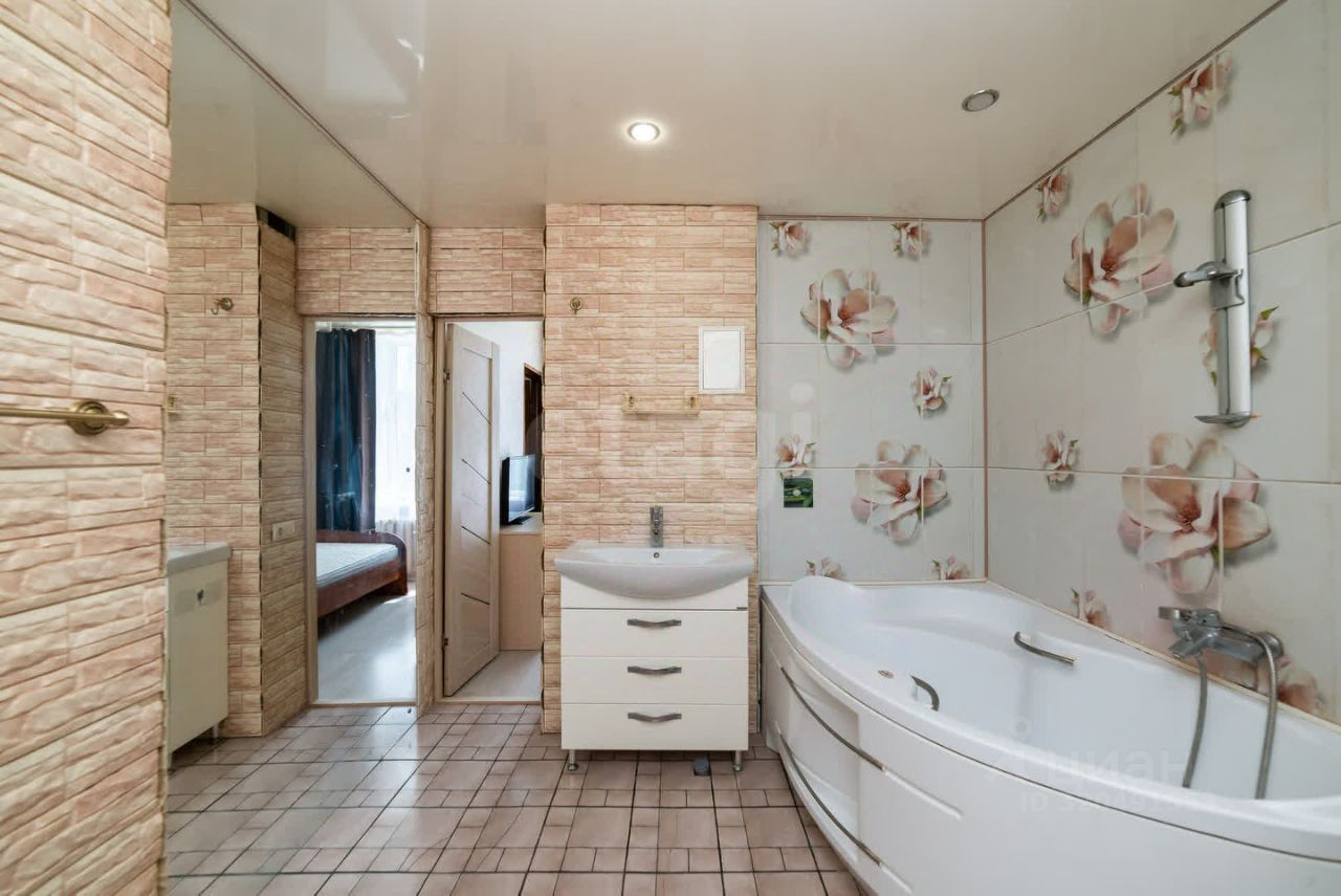 Что вас удивит в этой квартире - просторный санузел с большой ванной и зеркальными поверхностями на стене.