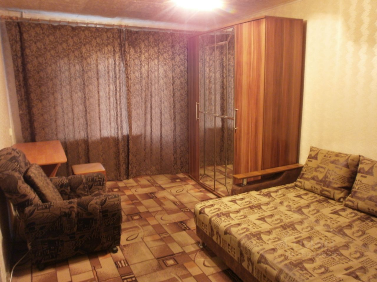 2/5, стеклопакеты, балкон застеклен. Имеется диван, кресло, шкаф, стенка, стол, шторы, кухонные шкафчики, кухонный стол, табуреты, холодильник, стиральная машина автомат, пылесос.