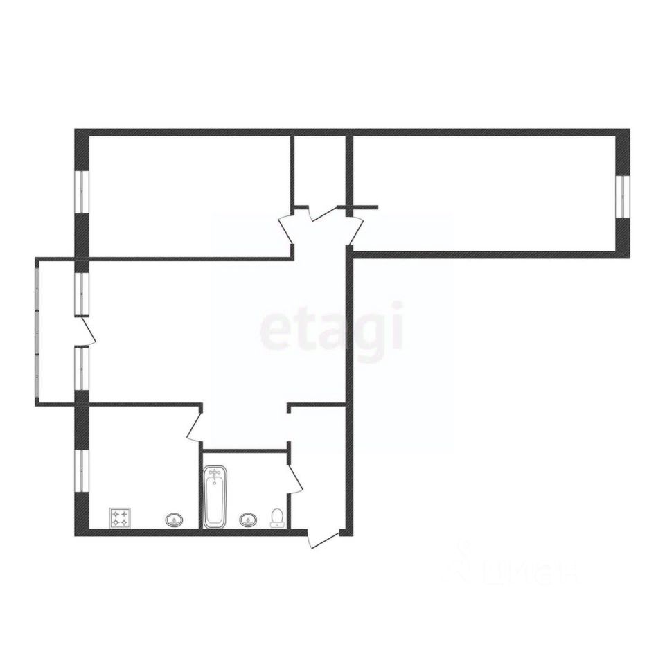 Площадь составляет 58.3 кв. м. из них кухня 6 кв. м. Одна комната проходная. Из квартиры можно сделать шикарную студию с двумя спальнями и отдельной зоной для приготовления пищи.