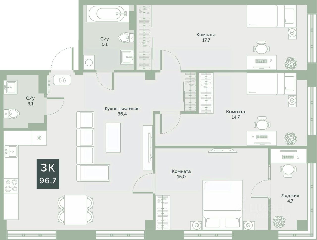Квартира с предчистовой отделкой, с продуманной функциональной планировкой: кухня-гостиная 36.4 м2, жилая площадь 47.4 м2, высота потолка 2,76 м.