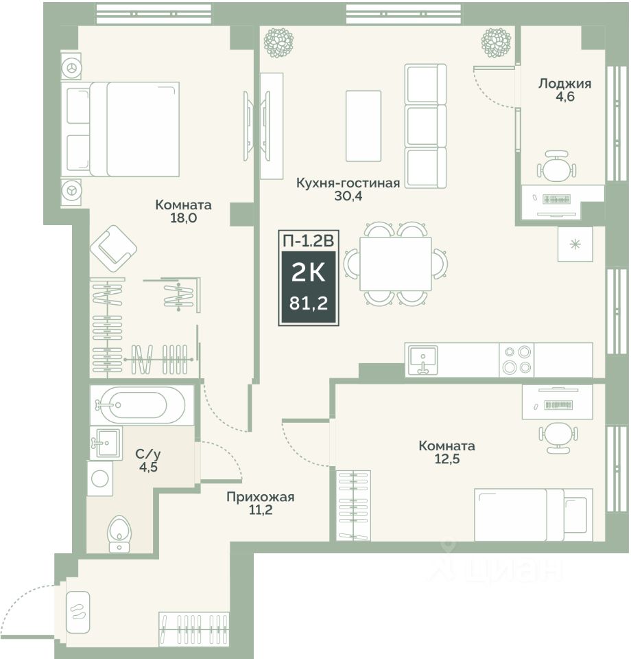 Квартира с предчистовой отделкой, с продуманной функциональной планировкой: кухня-гостиная 30.4 м2, жилая площадь 30.5 м2, высота потолка 2,76 м.
