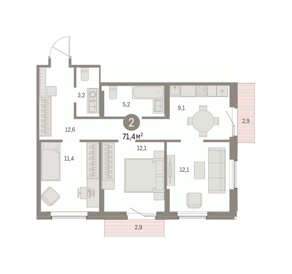 Двухкомнатная квартира с предчистовой отделкой в ЖК ''Дом Кино'' на 3 этаже. Общая площадь: 71.38 кв.м. Высота потолков 2.7 м.