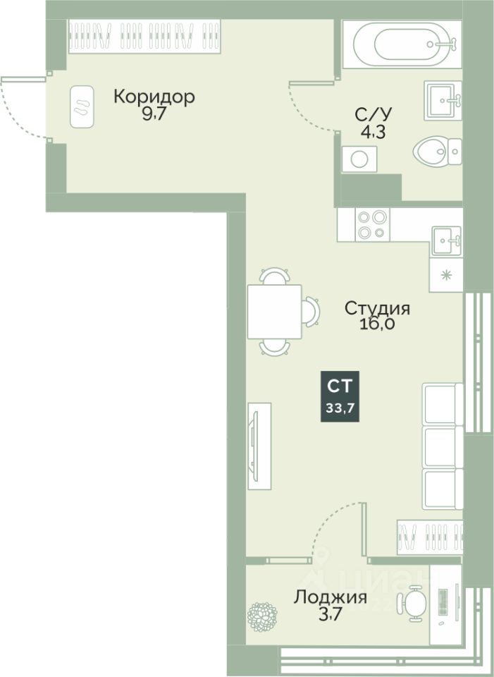 Просторная квартира-студия 155 в жилом комплексе комфорт-класса Районы-кварталы. Квартира находится в 4 подъезде 4 этапа. Этаж9-й из 7.