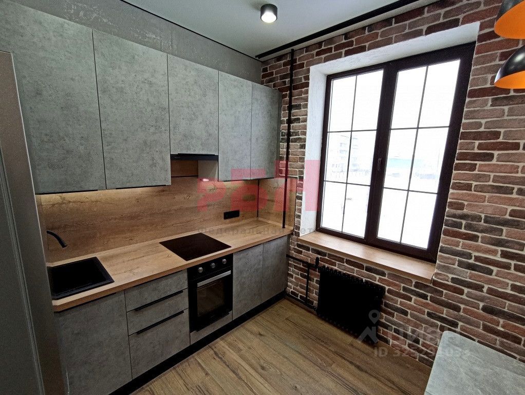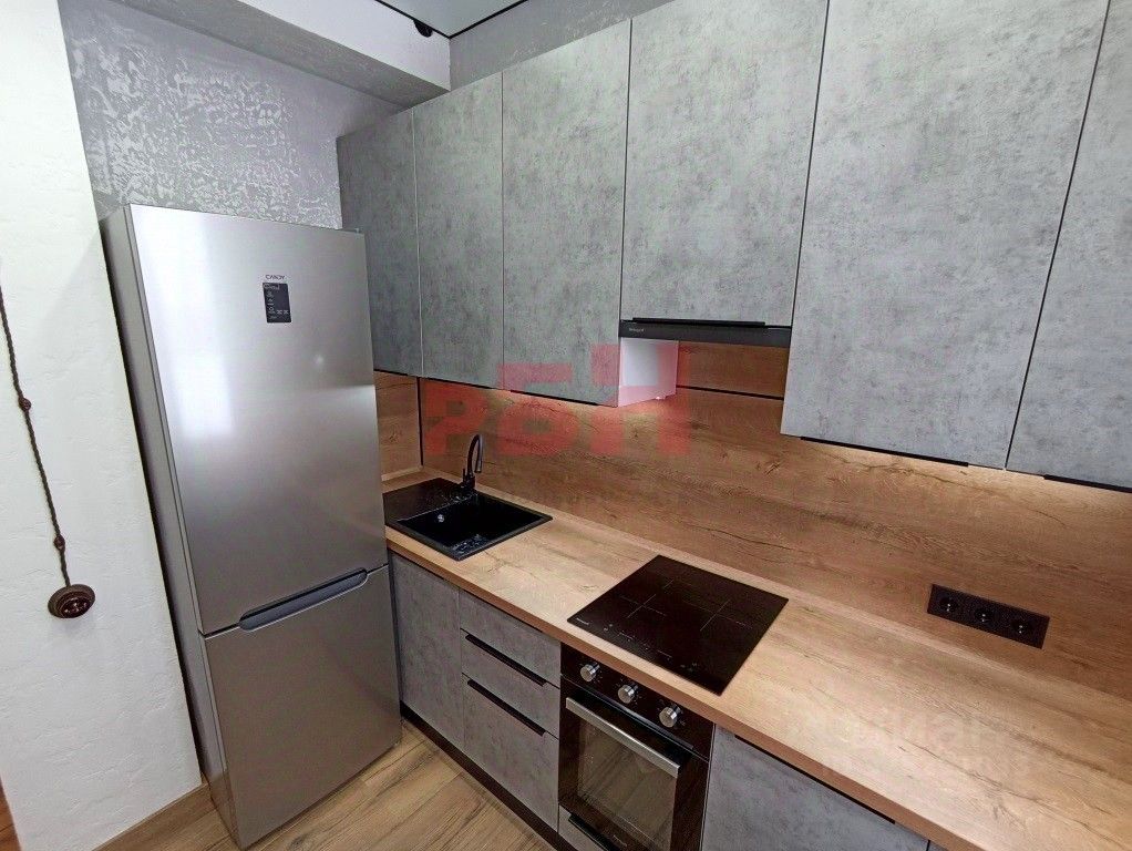 кухонная зона с электроплитой и холодильником