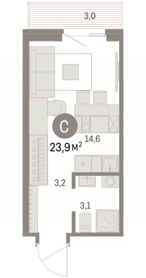Однокомнатная студия с предчистовой отделкой в ЖК ''Дом Кино'' на 10 этаже. Общая площадь: 23.91 кв.м., площадь гостиной 14.6 кв.м., из которых 5 кв.м. выделено под кухонную зону. Все окна выходят на одну сторону. В квартире один балкон, один совмещенный санузел. Высота потолков 2.7 м.