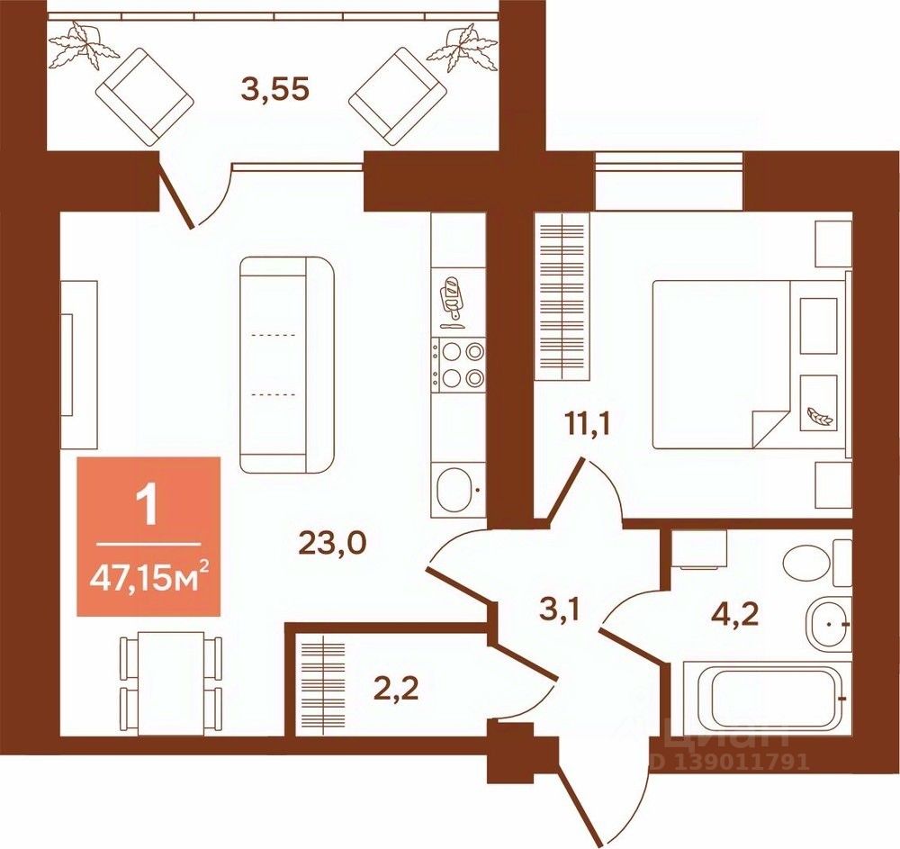 Продаётся 1-комнатная квартира в строящемся доме (Аргентовского, 125), срок сдачи: I-кв. 2027, общей площадью 47.15 кв.м., на 8 этаже. Новый жилой дом от застройщика ''Эверест'' расположен по адресу: г. Курган, улица Аргентовского.