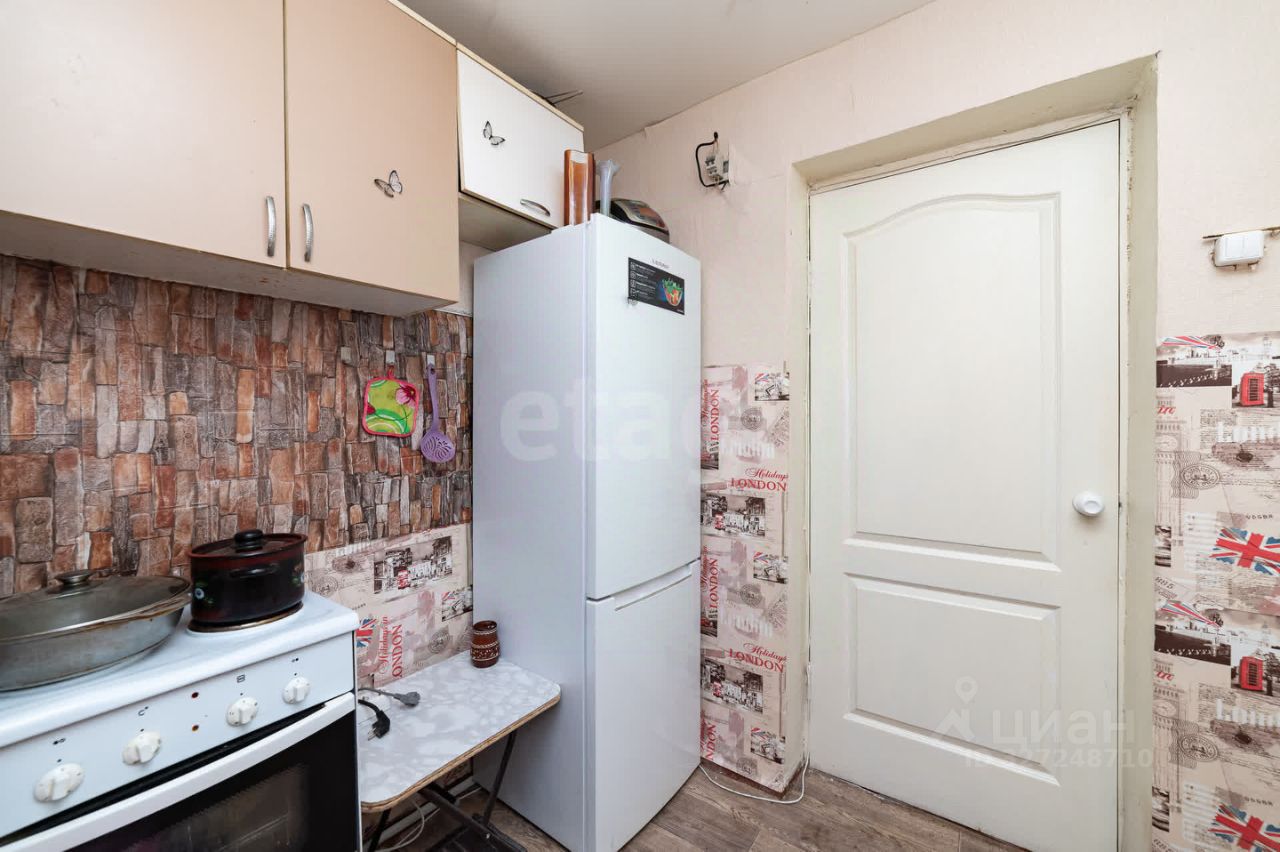В комнате имеется холодильник, эл. плита, стиральная машина, диван, шкаф, кухонный стол.
